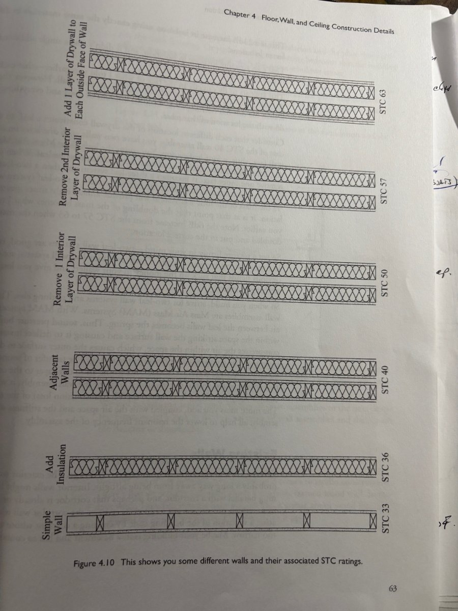 I know it won't be prevent bass drum, and loud snare drums from being heard outside of the room. Not even the double wall version is soundproof for drums. But the 7x9 space gives me enough real estate to build interior walls within the walls. And those interior extra walls will basically be freestanding, and uncoupled from the whisper room walls. This is far less costly (for me) than building the double wall structure from scratch. How can I get the ideal / highest STC for those extra walls ? Attached page 63 from Rod Gervais's book. What's the ideal construction for this inner room ? Most people would never add to a whisper room trying to improve it, but in this case, the Whisper room cost is cheap enough where it makes sense for me. :shot: