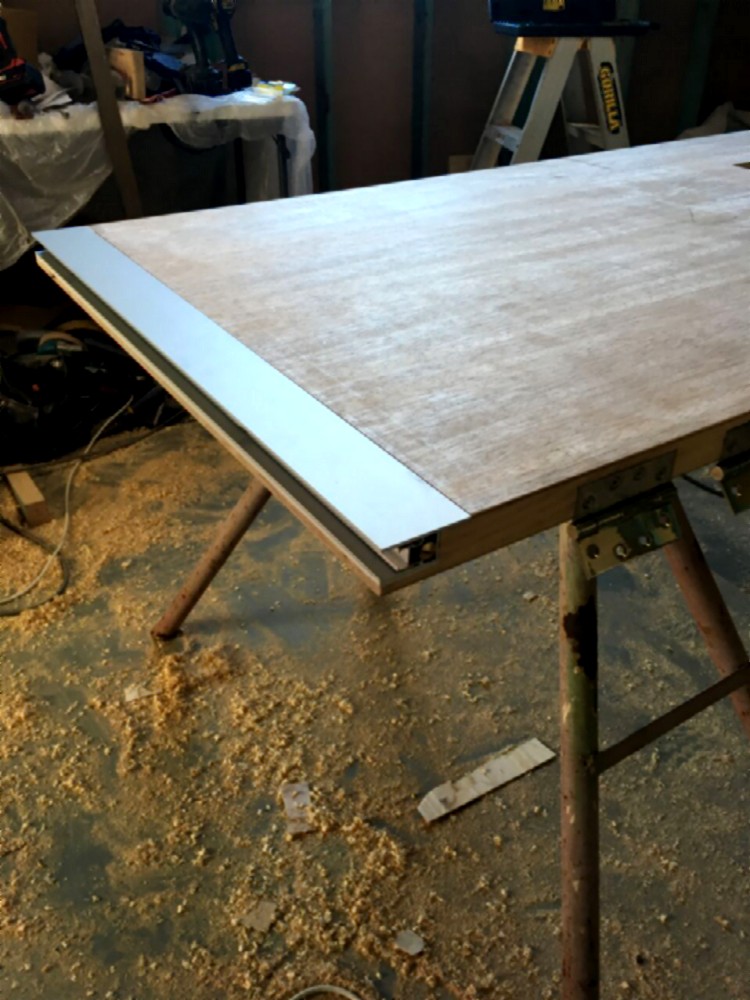 The drop down seal with all three layers of the door in place, glued and screwed together. The base layer is 44mm thick solid wood, and the other two layers are 19mm each, solid wood. Total thickness: 82mm (+/- 3 1/4"). Surface density of complete door: over 62 kg/m2. Each door weighs about 100 kg (220 pounds).