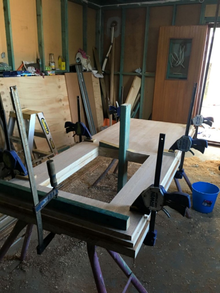 First we started out with an ordinary solid-core door slab (44mm - aprox 1 3/4"). Here's the base blank slab, with the location of the window marked, ready for cutting.
