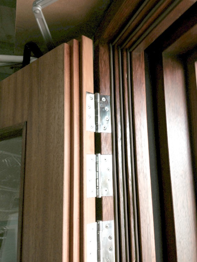 The second set of jambs is now in place here, to create the triple-seals. The nail holes have been plugged and sanded here, and the varnish is about to be retouched: