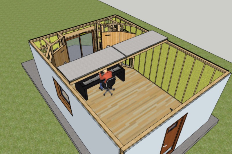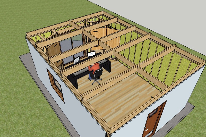 This is a close-up view of the same image, where you can see how the module is built: there's the wood framing, then a layer of plywood, then two layers of drywall on top of that. In this specific case I designed it like that, because the client needed very high isolation for his studio. For a typical studio, the second layer of drywall would probably not be needed. (However, don't guess! Do the math to figure out how many layers you need, and the thickness of each layer, to get the isolation that YOUR studio needs):