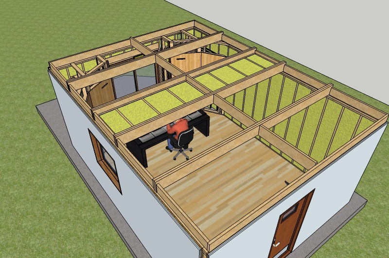 Finally, here's another way of doing an inside out ceiling for a smaller room, such as an isolation booth, which can work in some cases. The entire ceiling was built on the floor, then raised up using lots of heavy-duty manpower(!), and slid across into place, over the inner-leaf end wall. The outer-leaf end wall was then built. This method only works if you have no outer-leaf wall yet, and you have plenty of space beyond the inner-leaf wall to maneuver the ceiling... as well as plenty of strong people to do it!