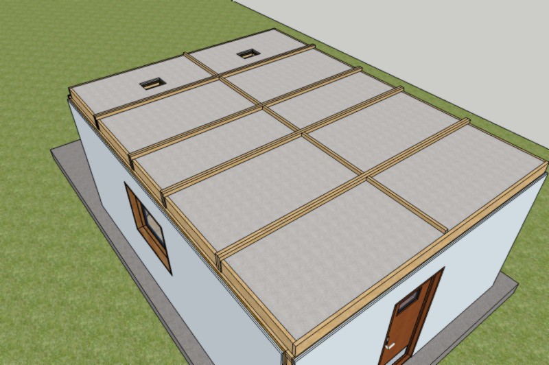 You start out by building a "backbone" of joists that are spaced much further apart than the standard 16" (400mm), but you double-up, or "sister" two joists at each location, side by side. This means that each of the modules can be much bigger than it would have been, which makes for more efficient use of materials, and less weight in the framing.
