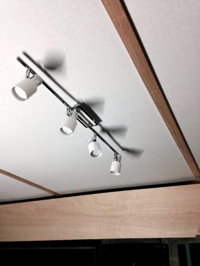 Another view of the wood trim pieces, showing how the wiring for the lights is done. The wiring is completely WITHIN the room: there are no penetrations through the ceiling here. The wiring runs in small holes drilled sideways through the joists, to the rear wall where the distribution panel is. (This is also important: Do not cut holes in your drywall to mount electrical boxes! All of the wiring must happen inside the room, with no penetrations of the drywall. There is only one single penetration though the inner-leaf, to bring in the power feed from outside, to the distribution panel, and that penetration is done in a special way to maximize isolation):