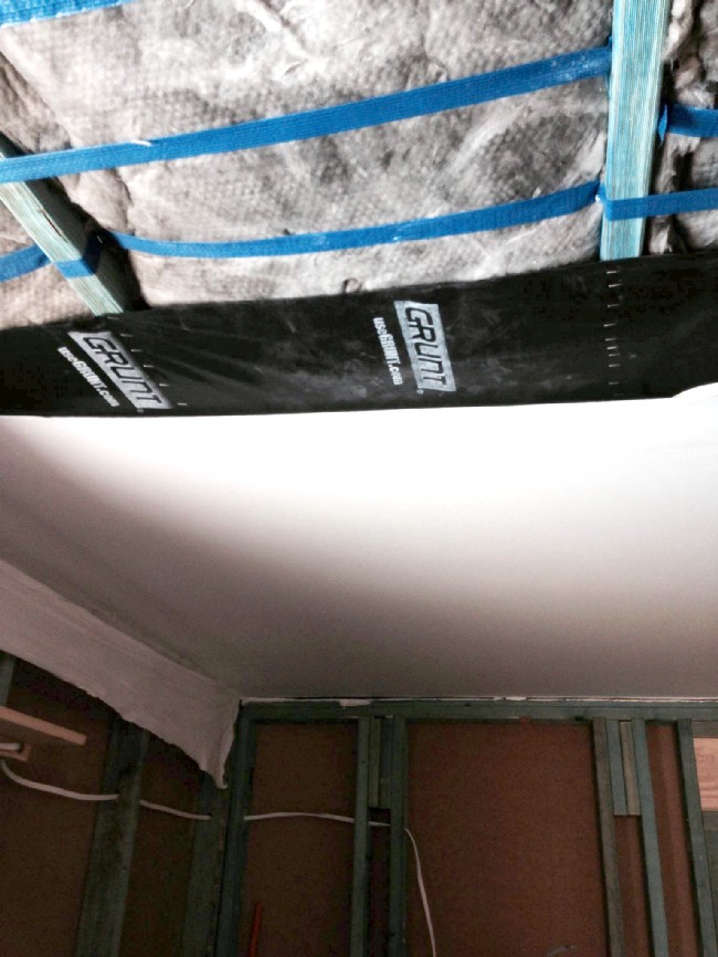View from inside the room, looking up towards the completed joist backbone. You can see the outer-leaf ceiling just above the joists. In fact, it looks like the inner-leaf joists are touching the outer-leaf joists, but in reality they are not touching: there's a gap of about 1" (25mm) between them. This is VERY important! For maximum isolation, the inner-leaf cannot touch the outer-leaf anywhere! Not even a single nail. They must be completely independent from each other, with no mechanical connection at all.