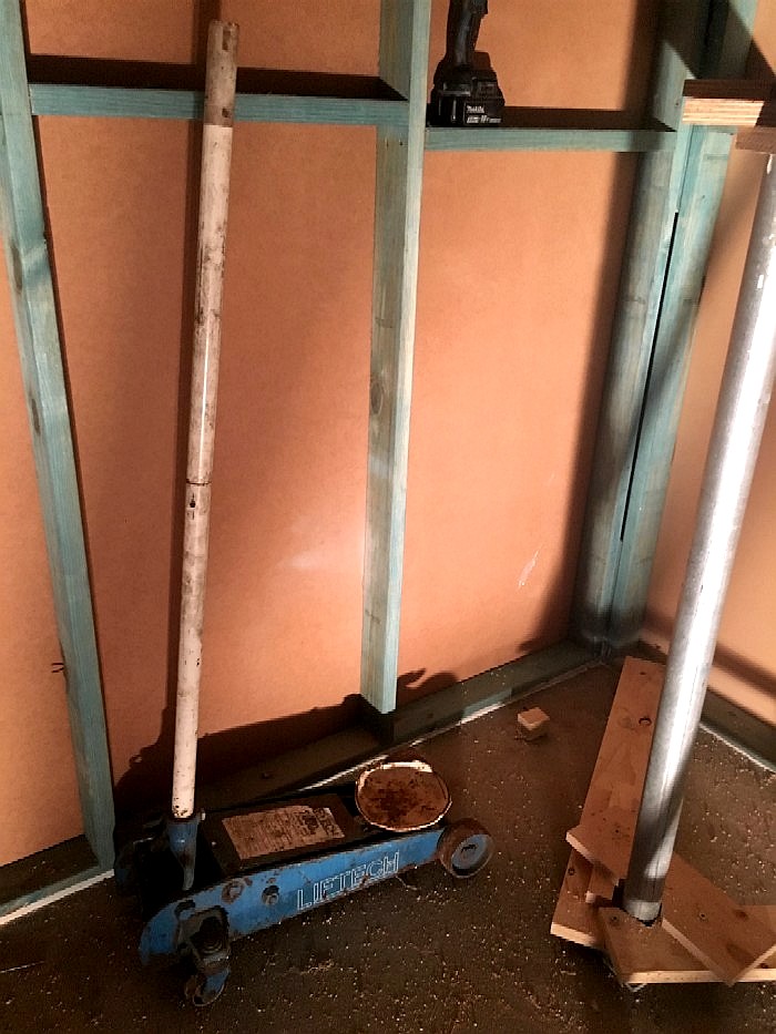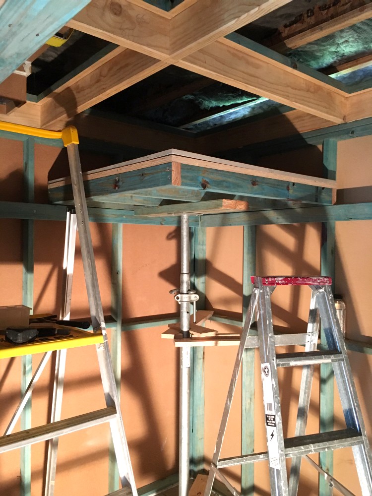 One module being raised into place, between the backbone joists. The client used a car jack to raise the modules (they are heavy), with a metal pole and bracing system that he invented. It worked very well, and was less expensive than renting a heavy-duty drywall lifter, which would have been another way of doing it.