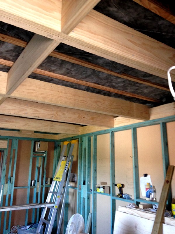 I have seen some people (even so-called experts) claim that there is no advantage do doing this, but they are not thinking things through, because the advantages are very real, and very clear. Their argument is that the ceiling ends up at the same height anyway, because the joists are in the same place, so there's no advantage. But in reality that is not true: the acoustic ceiling is much higher than the lower edge of the joists, and that's what matters most. The actual hard, solid, boundary surface of the room (the sheathing) is way above the level where it would have been for a conventional ceiling. You gain back all of the depth of the joists, and all of the space between them. That would have been lost with a conventional ceiling, since it would have been above the sheathing, outside of the room, but with this method that space is now inside the room. In effect, your room is now several inches higher than it would have been, from the acoustic point of view. If you have 2x8 "backbone" joists, for example, then you have gained over 6" in acoustic height (allowing for the thickness of the drywall), and if your backbone joists are 2x10 then you have gained nearly 9" in room height. For a small room, that's a LOT of extra air volume in the room! And that's a very good thing.