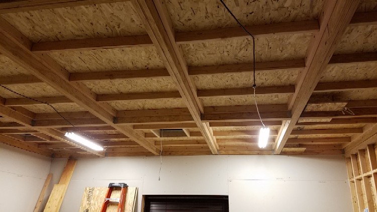 This is the "backbone" or "skeleton" of the ceiling, consisting of the doubled-up joists and rim joists, before the ceiling modules go in. You can see that the joists running across the room are "sistered": each joist is actually a pair of joists, side-by-side. The large holes in between the joists is where the modules will go: