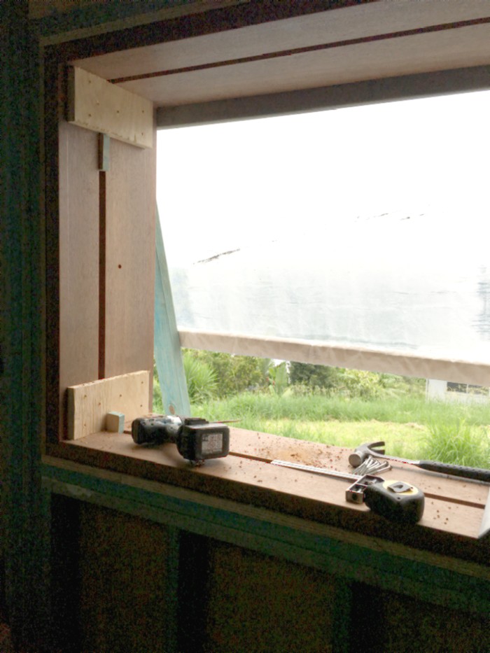 And finally, the finished window from the inside, with all the blocking and trim in place, and the wall also completed (the wall is built "inside out" in this case):
