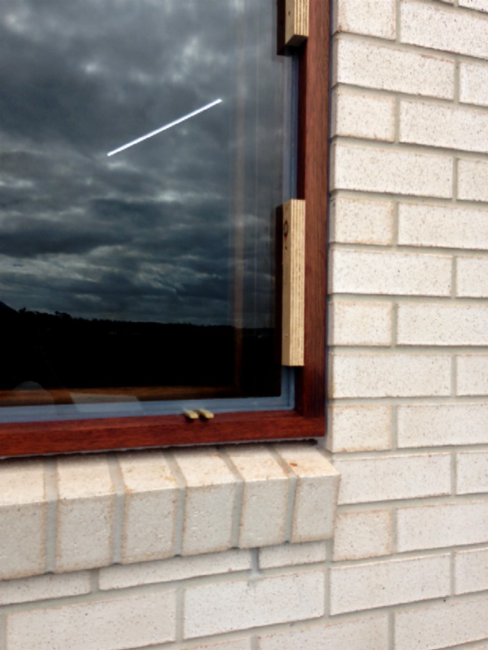 A view of the final finished window from the outside, with the front blocking and trim in place.