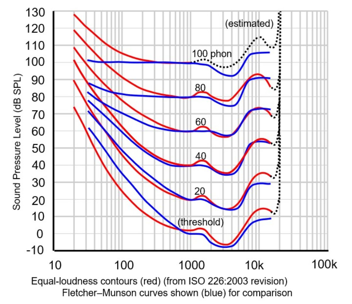 another tone played at the same time, but with a different frequency, until they thought it was the same level as the 1 kHz, 100 dB reference tone. Then they would measure the REAL level of that second tone, and plot it on the graph. They did that for a whole bunch of different frequencies, asking people to match the 1 kHz tone, they they drew the graph that shows the REAL level of each frequency, that average people said was the same loudness as the reference tone. (Then they did that all over again, but with the reference level at 90 dB... then repeat again at 80 dB... etc. For all possible sound levels, in 10 dB steps, and all possible frequencies [also in steps]).