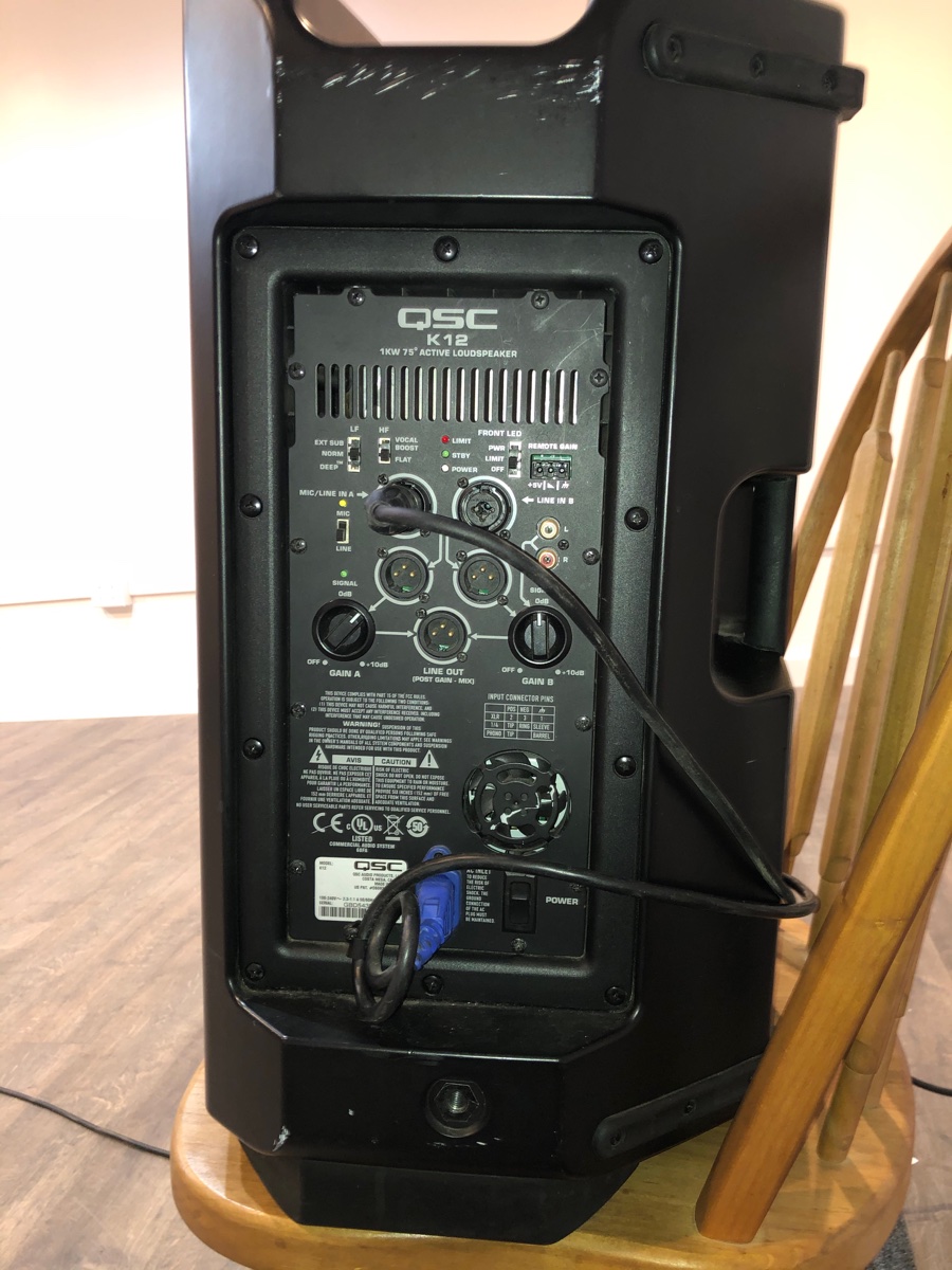 In regards to no low end coming out of speakers, here is a photo of the settings on the back of the QSC. It is on flat.
