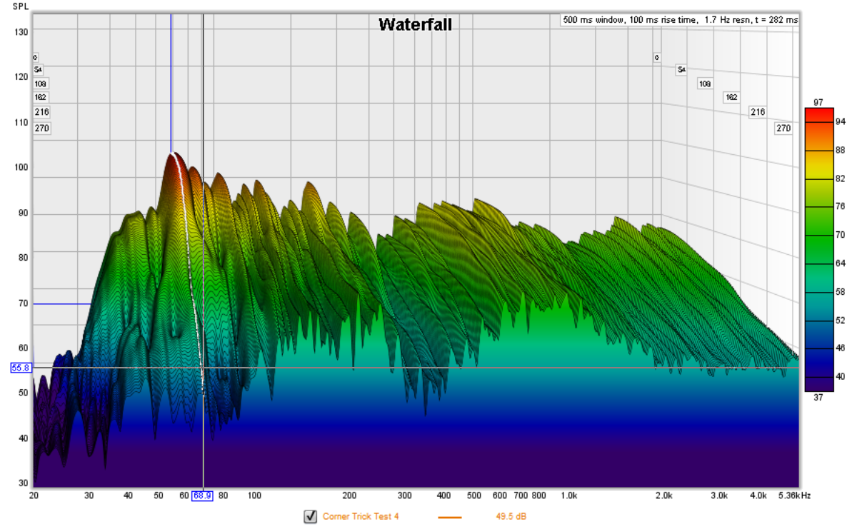 The other interesting thing you can see there is that, even with the LF set to "flat", there is actually a pretty big LF boost! It's roughly 4 dB boost at 71 Hz, with fairly tight EQ. That's probably the bass reflex ports, and there is some low-level ringing going on there, so that makes sense. You can see that here too, in the waterfall plot, below...