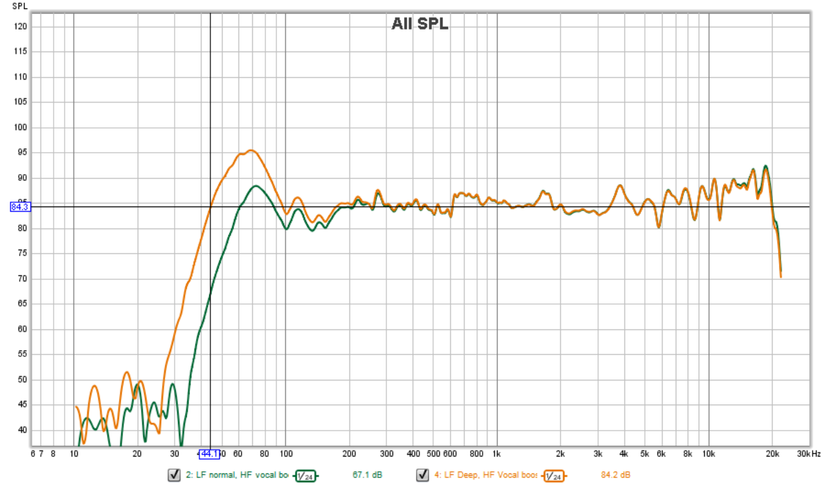 As I suspected, that returns some of the missing upper mids. So I would keep that "vocal boost" switch on for now, for all future measurements. It gives you flatter response, with a roughly 3 dB increase, centered around 2.5 kHz, and covering a range of about 4 octaves. That solves one mystery: the missing mids are not a room problem, but rather an EQ problem.