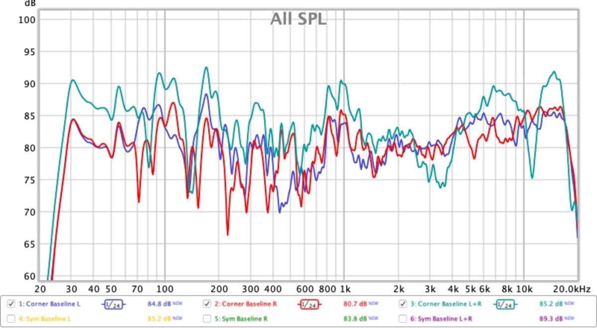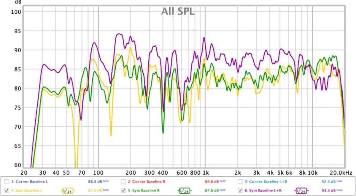 One final test which is interesting is another full L / R / L+R measurement from the exact mic position from the "Symmetrical Baseline" test, but with the speakers moved to the corner position. I thought this might illuminate which issues are SBIR and which issue are modal.