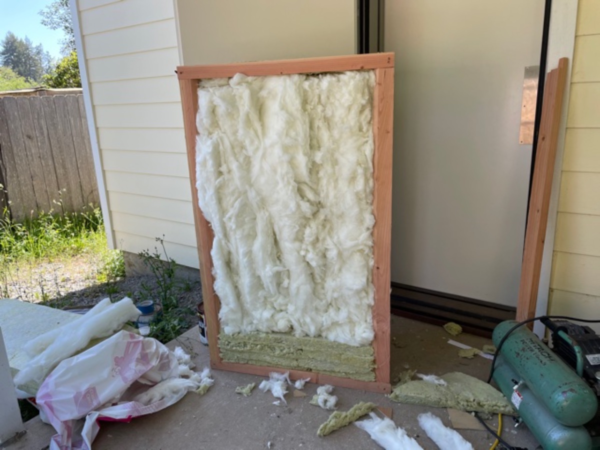 For the bottom traps I used left over Safe n Sound and for the top traps I used mostly attic R30 insulation. To avoid compression, my carpenter put a partial shelf half way up in the bottom Safe n Sound traps, and for the top R30 traps, he stapled the paper backing of the insulation to the frame and then filled in with long vertical pieces of insulation.