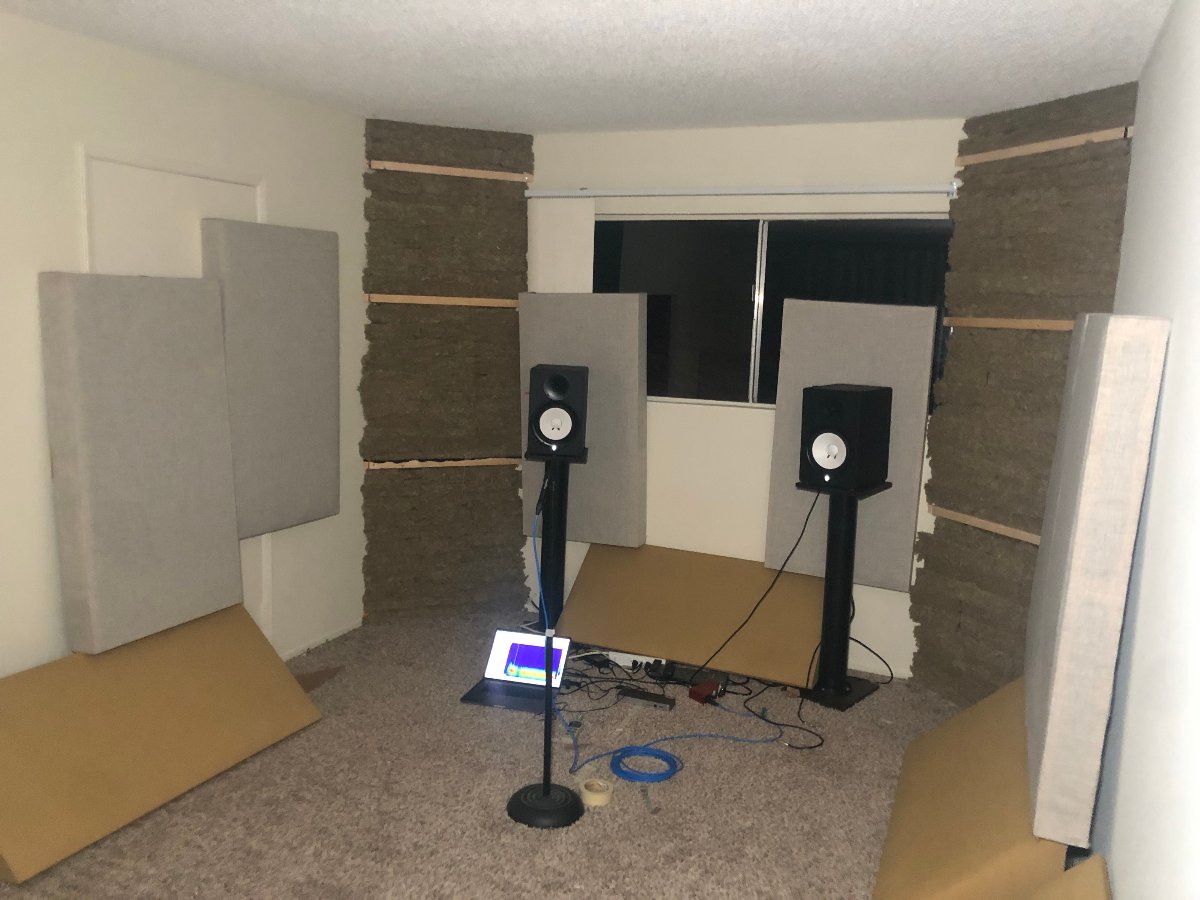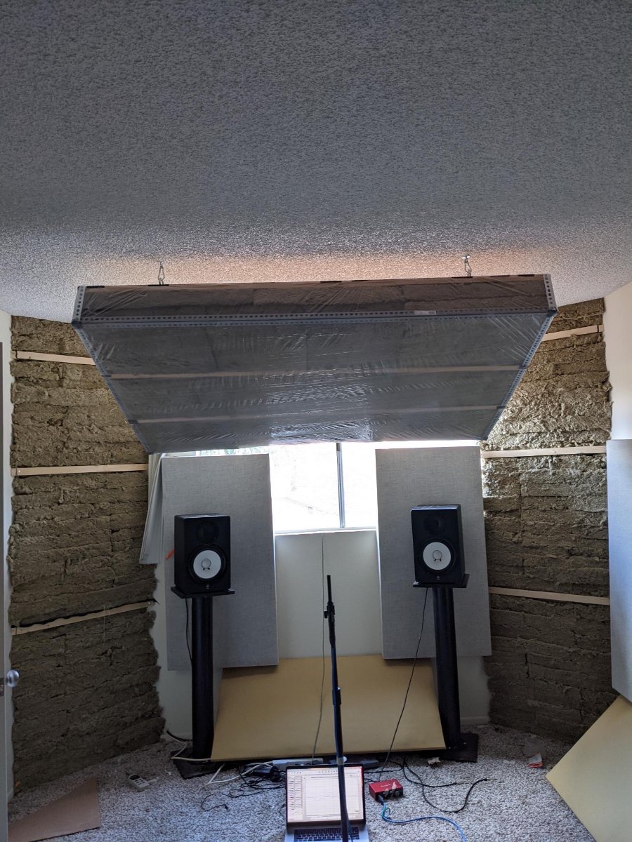 Thankfully i tested it before wrapping in fabric, however i had to disassemble it, rip and frame my 4' x 6' cloud down to two separate 2' x 6' clouds. they are about 7" thick with Rockwool Safe n Sound, and a 1 and 3/8" thick hard backing made of 5/8" MDF and 3/4" plywood glued together, with 6 inches thick of Insulation. They still seem a bit too large for my ceiling height but for now but it seems to help on the early Impulse chart.