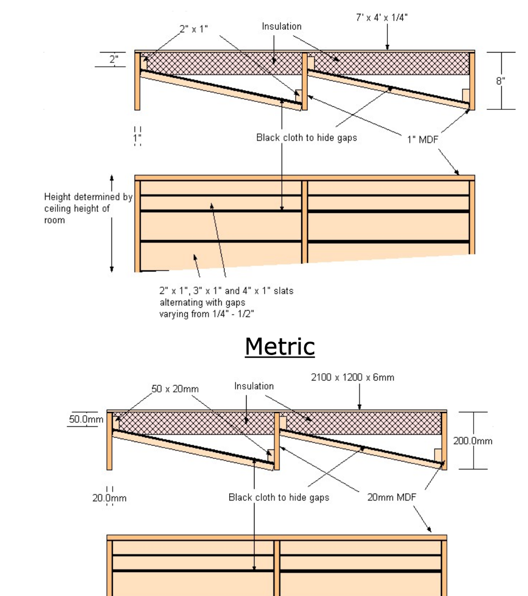 I was already thinking of pushing my current sidewall first reflection traps back towards the couch to cover more wall in the rear and building this trap designed by John Sayers. One because i think some wood and angled dimension would help break up the monotony of mostly fabric/ parallel wall and also in the hopes that it may sound better at the listening position.