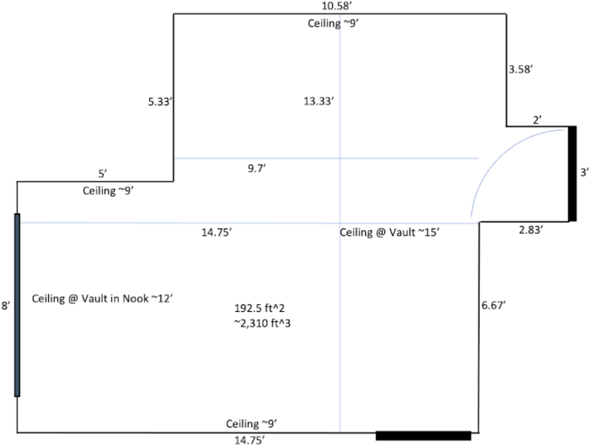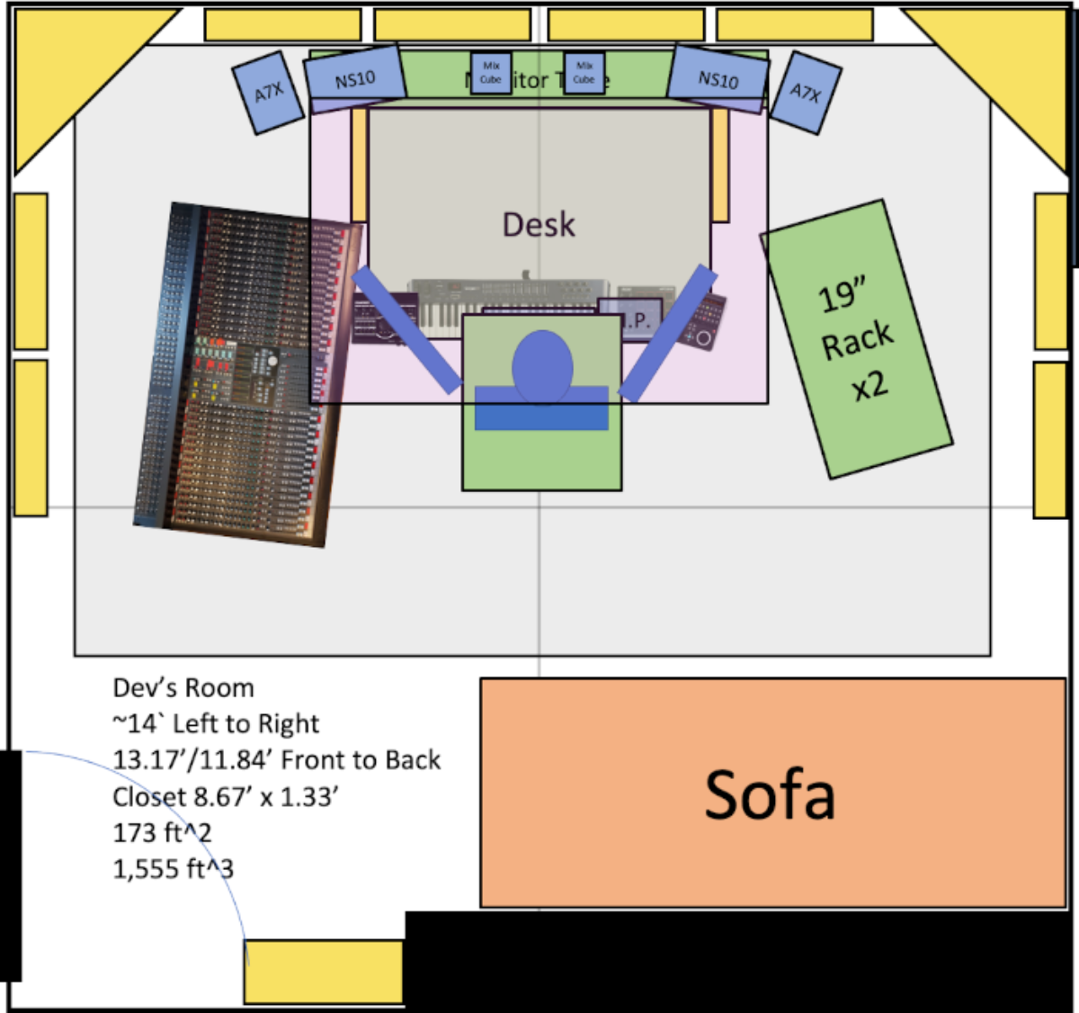 I'm moving my studio into a house and I have two room available to me for my new studio. Neither are very good. One is a typical square bedroom, but decent size, 14'x~13'x~9'. The other is a larger bedroom with more square feet and cubic feed due to a vaulted ceiling but a really weird geometry.