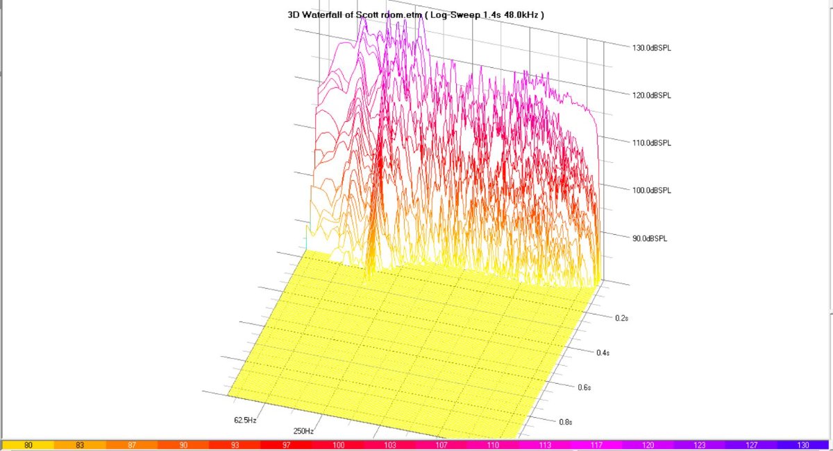 Stuart said. "On the waterfall graph, there seems to be some type of strong modal resonance at a little under 120 Hz, which is unusually high for a treated room, so once again I'm assuming that some treatment is missing from the side walls (since that would probably be the 0.0.3 mode)."