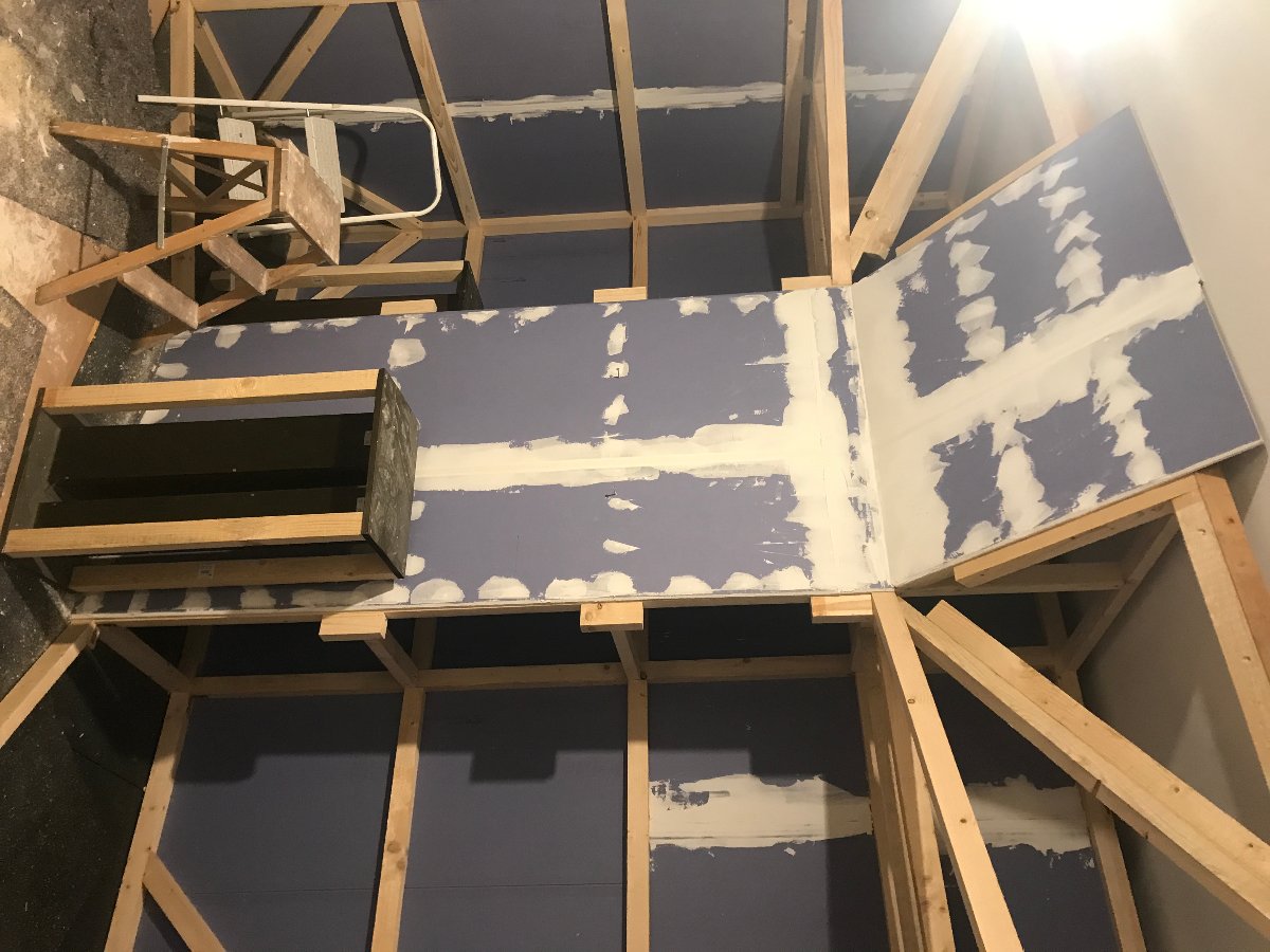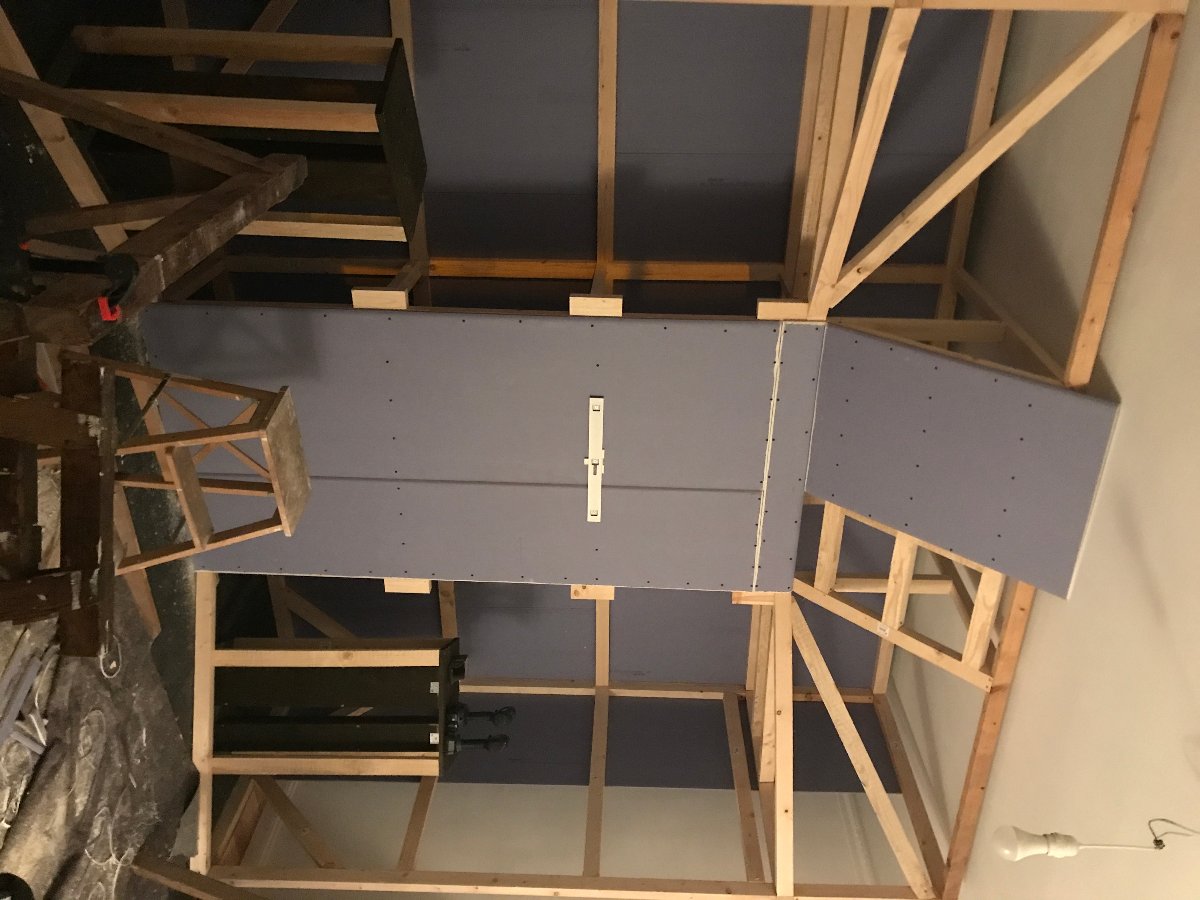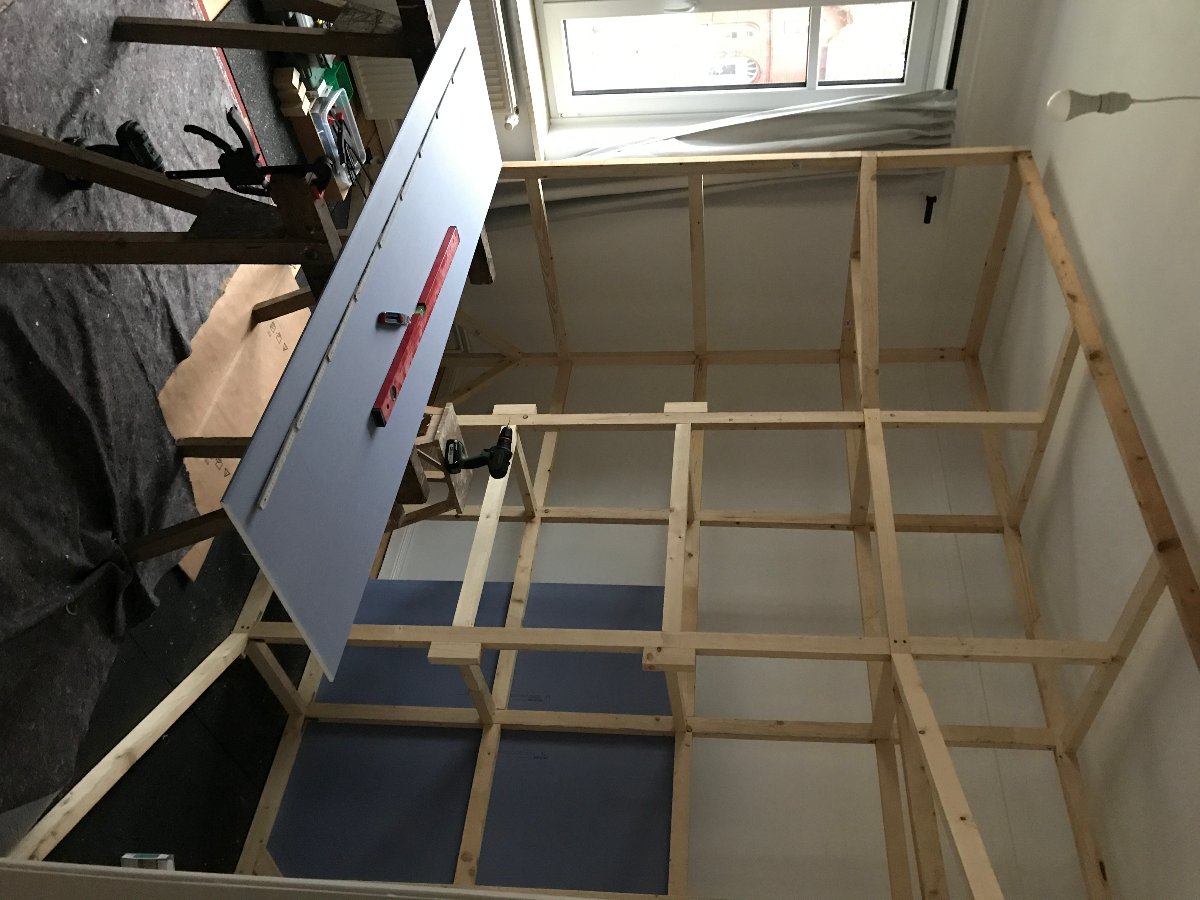 First i measured my Room empty and located the best listening spot/best balanced low frequency spot. I then started to build a wood framework which has an airgap of 30cm left, right and behind against the back wall. I am now encasing the whole framework with sheetrock which i wanted to paint. Everything is sealed except the upper part because i can't reach the ceiling. The speakers will be placed on home made speaker stands filled with sand to make them really heavy. Front holes for the speakers will be cut through the sheet rock and the whole cavity will be filled with mineral wool with a low density.