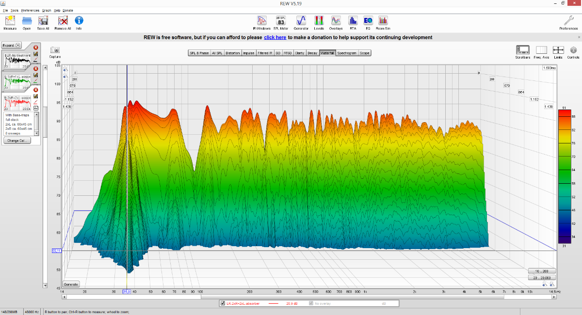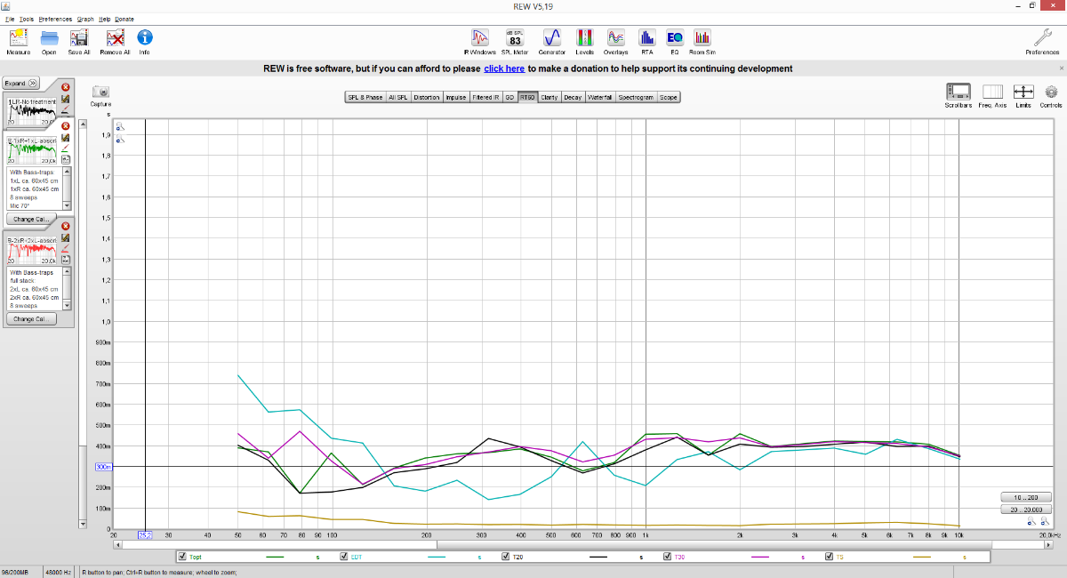 All in all the treatment seems to have good and bad effects. The good ones can be seen when having a look at the RT60 and waterfall graphs regarding the decay times which are reduced with the first treatment and completely stemmed under 300 ms with the second treatment if we ignore the extreme decay at about 36 Hz. Since 36 Hz is a very low frequency I think it would not cause too much trouble.