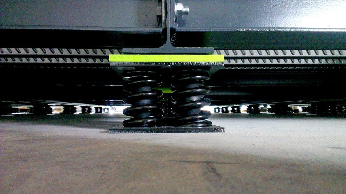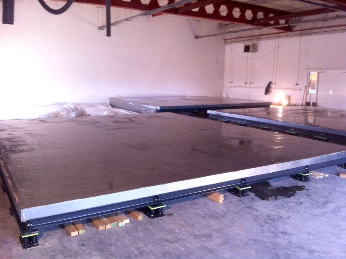 Just to put all of this in perspective, this is what a properly floated floor looks like: Note the thick reinforced concrete slab, and the thick steel girders and framing. And here's a close-up of that thick steel frame, along with the large steel coil springs: Anything less than that is not going to work for a studio.