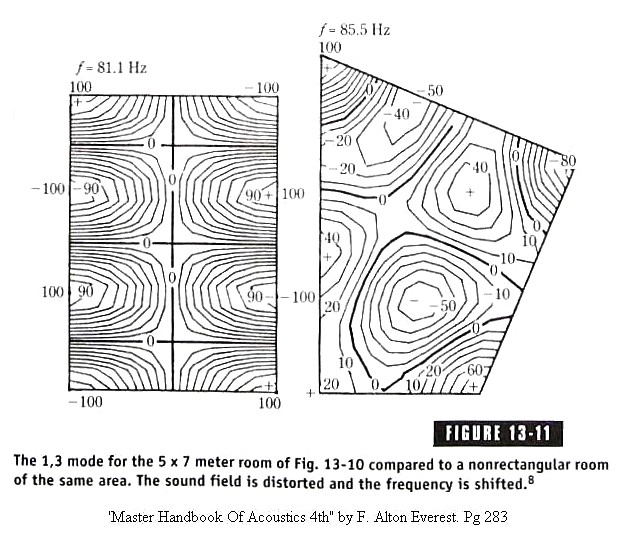 Thus, "room modes" seem to be really bad (that's not true either... modes are good, not bad... more on that in the article on modes and what to do about them). Those people who think it would be good to make all modes "go away" sort of remember that standing waves only form between opposite surfaces in a room, bouncing back and forth... so they figure that if you could just ANGLE one of those surfaces, then that would upset the "bounce": the wave would bounce at a different angle, going off to one side, and the mode would go away! Except that it does not work like that (and even if it did, it would not be a good idea to get rid of a mode: they are good, not bad).