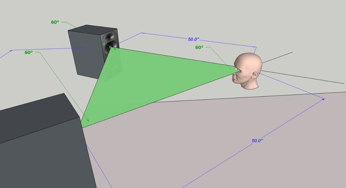 There you have it: the angle for each corner of the triangle is 60°. Equilateral. The speakers are 50" /127cm) apart in this hypothetical setup, and the distance from each speaker cone to the apex of the triangle is also 50". Equilateral. I chose those distances for simplicity, because in most small home studios, that's about the way things commonly end up.