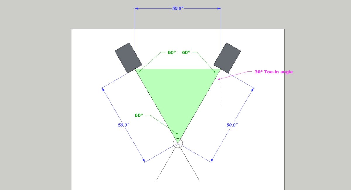 That's how much you would have to rotate your speaker to get this setup, if you started with the speaker aiming straight down the room, not angled at all. For the famous "equilateral triangle" setup, the toe-in angle is 30°, as you can see above.