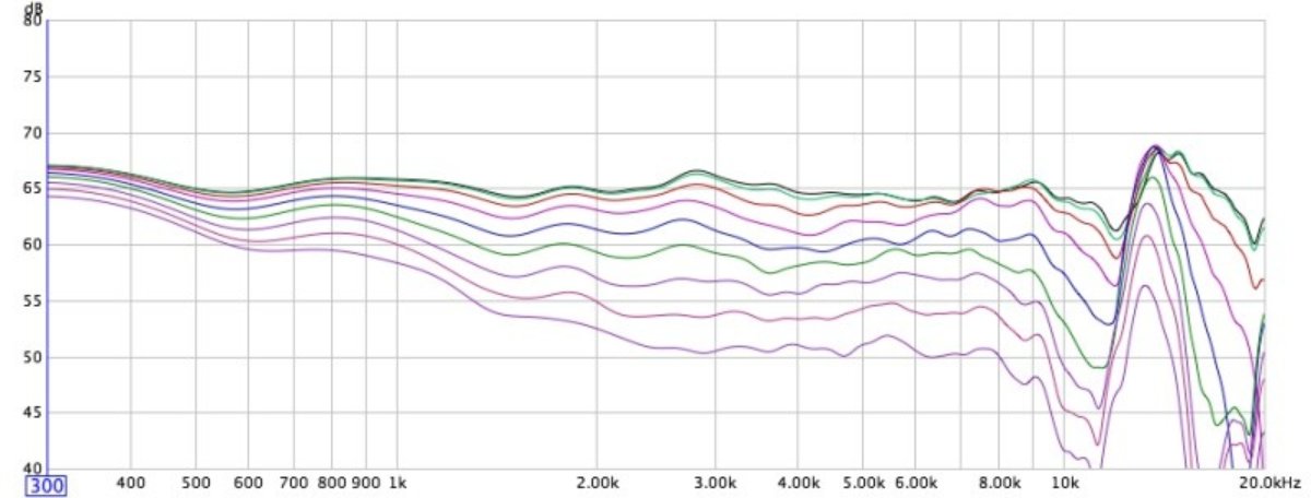 Think about it. Every speaker manufacturer will tell you that the absolute flattest, cleanest sound from their speakers is "on axis": when your ear is lined up perfectly with the acoustic axis of the speaker. Even the pretty graphs with wiggly lines on the graphs that they print in the manuals, show the "on-axis response", and usually a few extra squiggles, for various degrees of "off-axis"... and those off-axis squiggles are always far worse than the on-axis one. Here's an example of such a graph (for a rather lousy speaker!). The top squiggly line is "on axis" response, while all the others are progressively further "off axis":