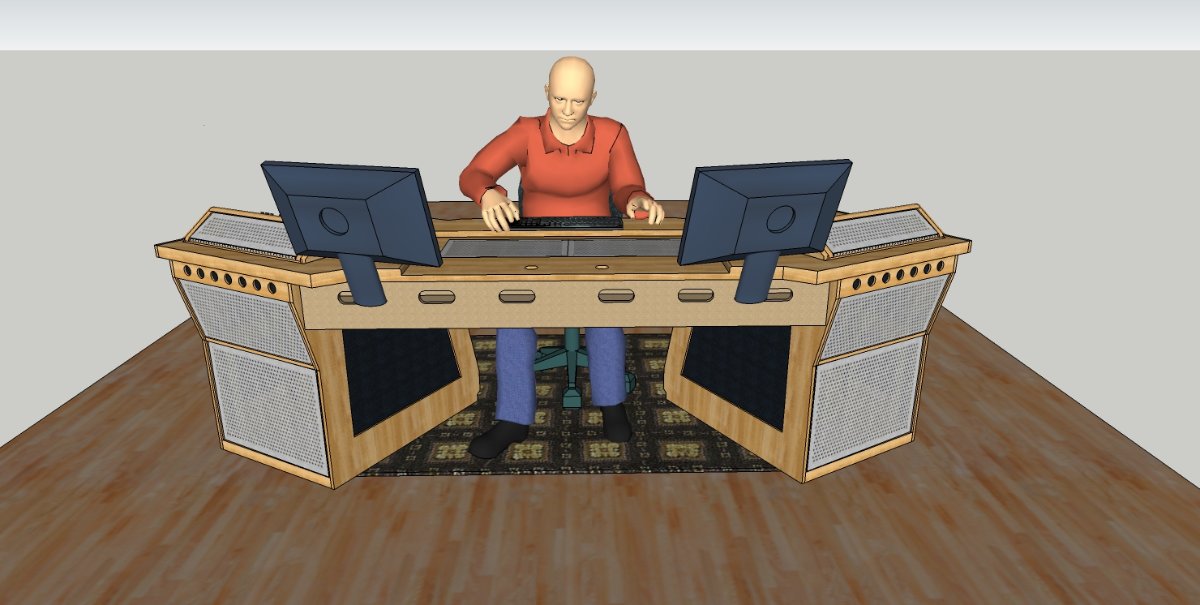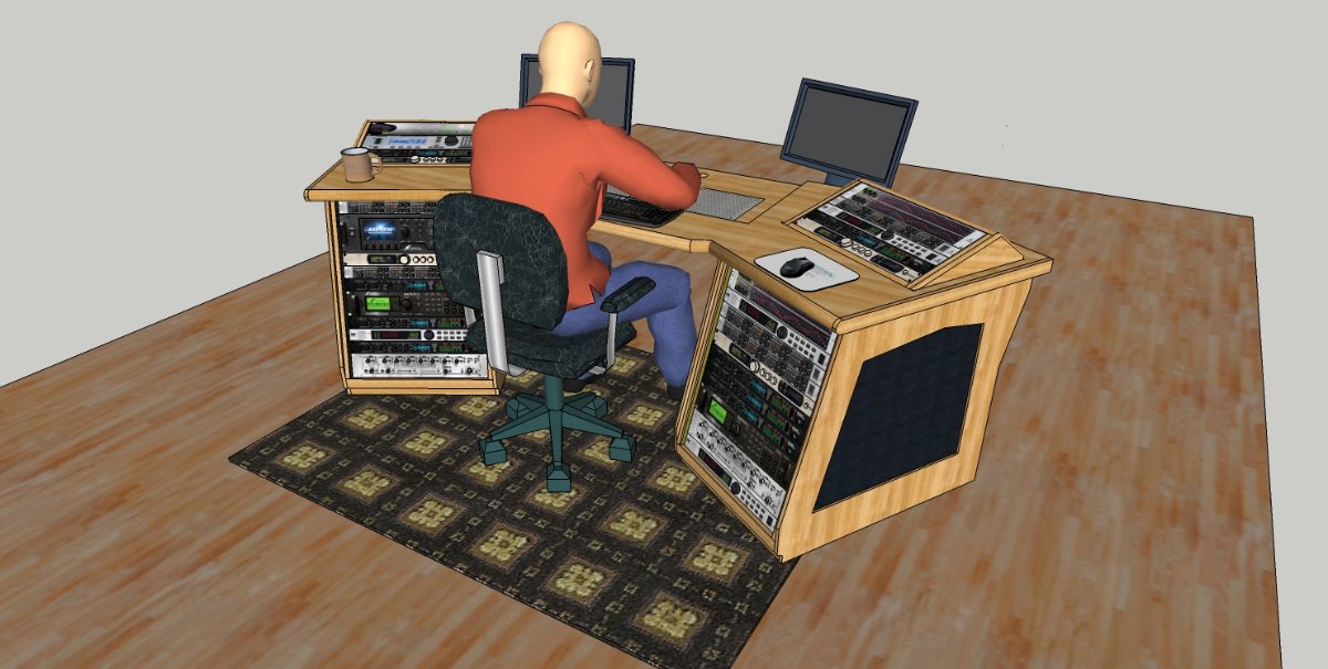 It's an acoustically low-profile desk for control rooms, that tries to present as small of an acoustic obstacle as possible, while also being compact and versatile, as well as relatively easy to build for the DIY home studio builder. It has plenty of rack gear space, most of which is easily accessible from the mix position: 12 RU on the sloped upper modules (6 on each side), 28 RU on the front faces of the legs (14 on each side), and another 18 RU around the back (9 on each side). Total rack unit space: 58 RU (and could be 62 at a pinch). That's about one and a half full size equipment racks: more than enough for the majority of studios!