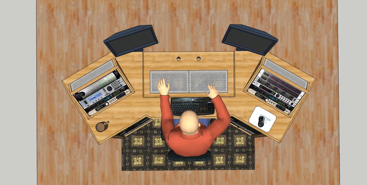 Low profile also means that everything is kept down as low as possible, so it won't get in the way of the direct sound from the speakers to your ears. Or rather, it interferes as little as possible. The gear racks on the top surface of the desk are tilted steeply for the same reason: no reflections from speakers to ears. But the angle is still high enough that the gear in those racks can be seen, reached, and operated comfortably. There are no shelves on top of this desk (a stupid idea for a control room desk!), and no vertical stacked rack gear. The computer monitors are also positioned to help a little with floor bounce.