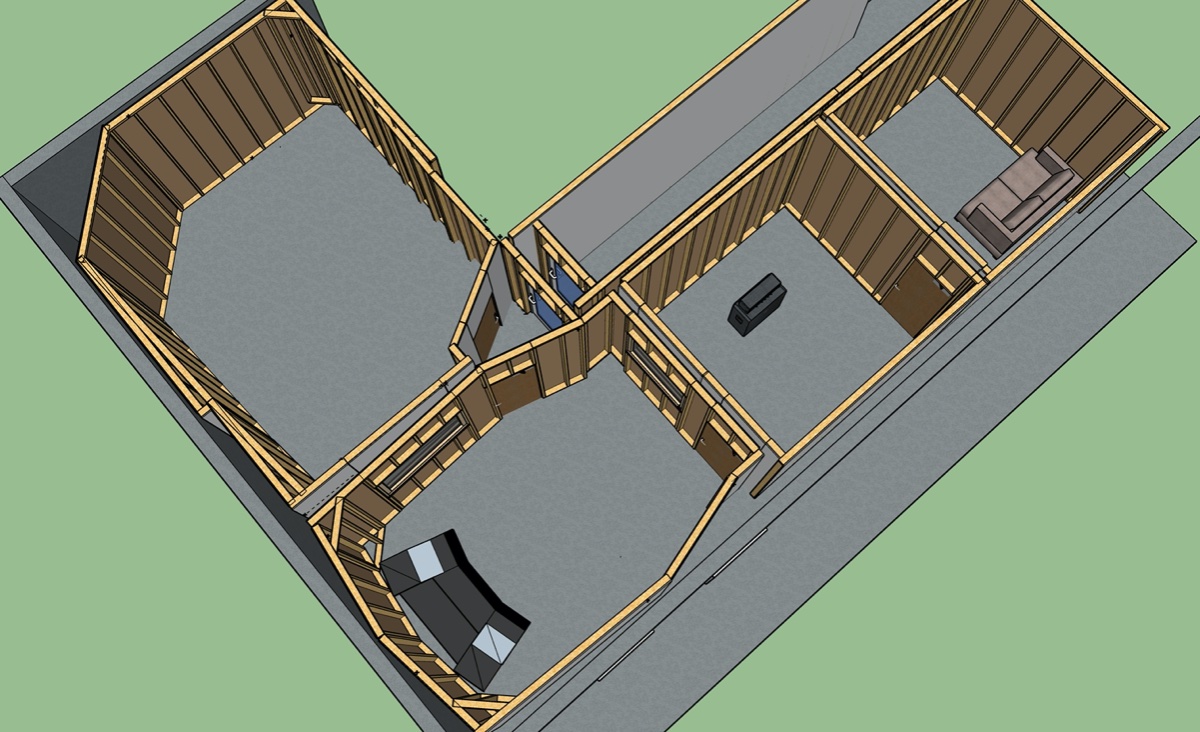 The supposed need for angles is a myth! I cover that here: Angled walls: What are they for? Do you need them? That's mostly about control rooms, but also applies to live rooms. Basically: angling walls, or even surfaces within a room, does nothing at all to deal with the acoustic problems in the room. What it DOES do, is make the room smaller, and therefore WORSE, acoustically. There is nothing at all wrong with a rectangular room, that is then treated as needed to get the response under control.I left the amp room just a rectangle, as I am guessing that I will need to do some angling, trapping, etc. based on the acoustics.