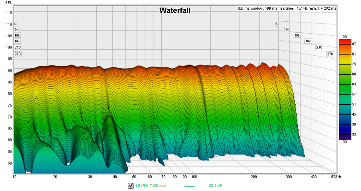 Ahh, what the hell: Might as well go the whole nine yards, and show the FULL SPECTRUM waterfall plot (12 Hz to 22 kHz), smoothed to 1/3 octave: (Actually, that's not really "full spectrum", but rather "even more than full spectrum". Normal human hearing is typically listed at 20 Hz to 20 Khz, so a range from 12 Hz to 22 kHz is extending down almost an entire octave below the bottom of the human hearing spectrum, as well as pushing up 2,000 Hz above the top end. And yes, there really are subs that get down to 12 Hz without breaking the bank, and tweeters that don't freak out above 10 kHz, like some cheap ones do.)