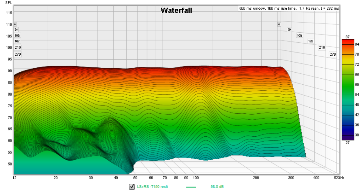 Low-end and mid-low waterfall plot (12 Hz to 500 Hz):