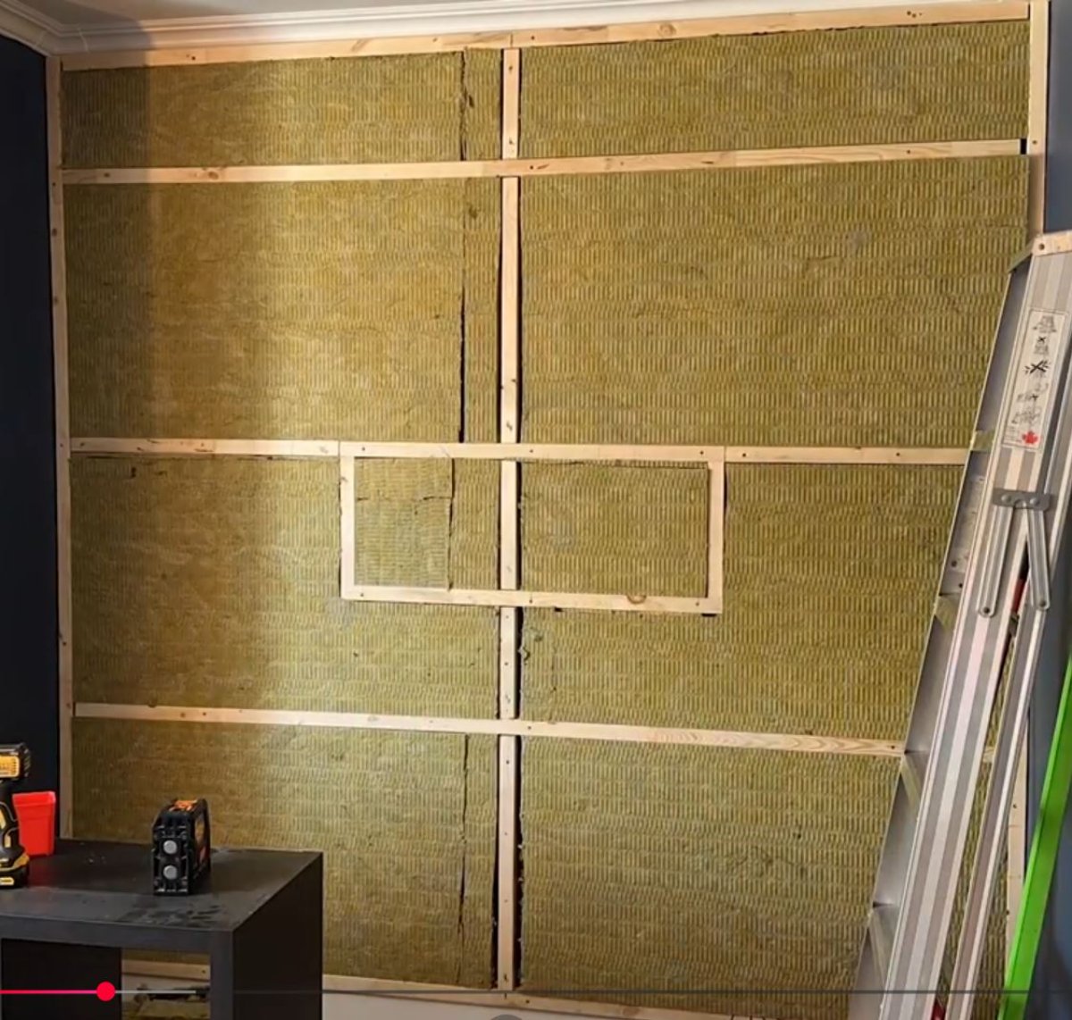 While researching how to do this, I found an interesting method for creating one that incorporates sound-absorbing material, and I thought it might be a good idea, despite the fact that I haven't done any acoustic testing yet, considering my studio monitors will be nearby. I also plan to mount the front speakers of my 5.1 system on this wall.