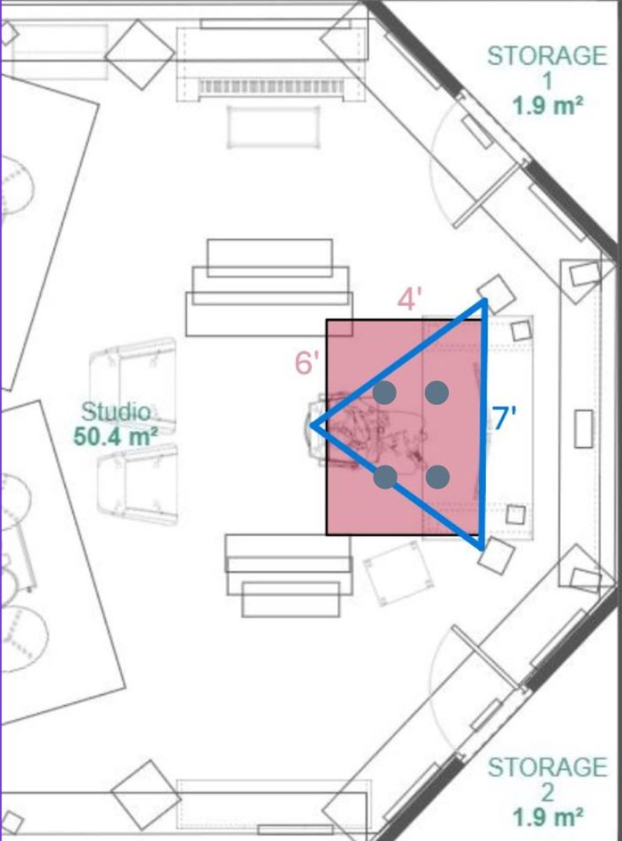 My priority is to first position the main studio monitors optimally, creating a 7-foot equilateral triangle. Then I will place the other speakers.