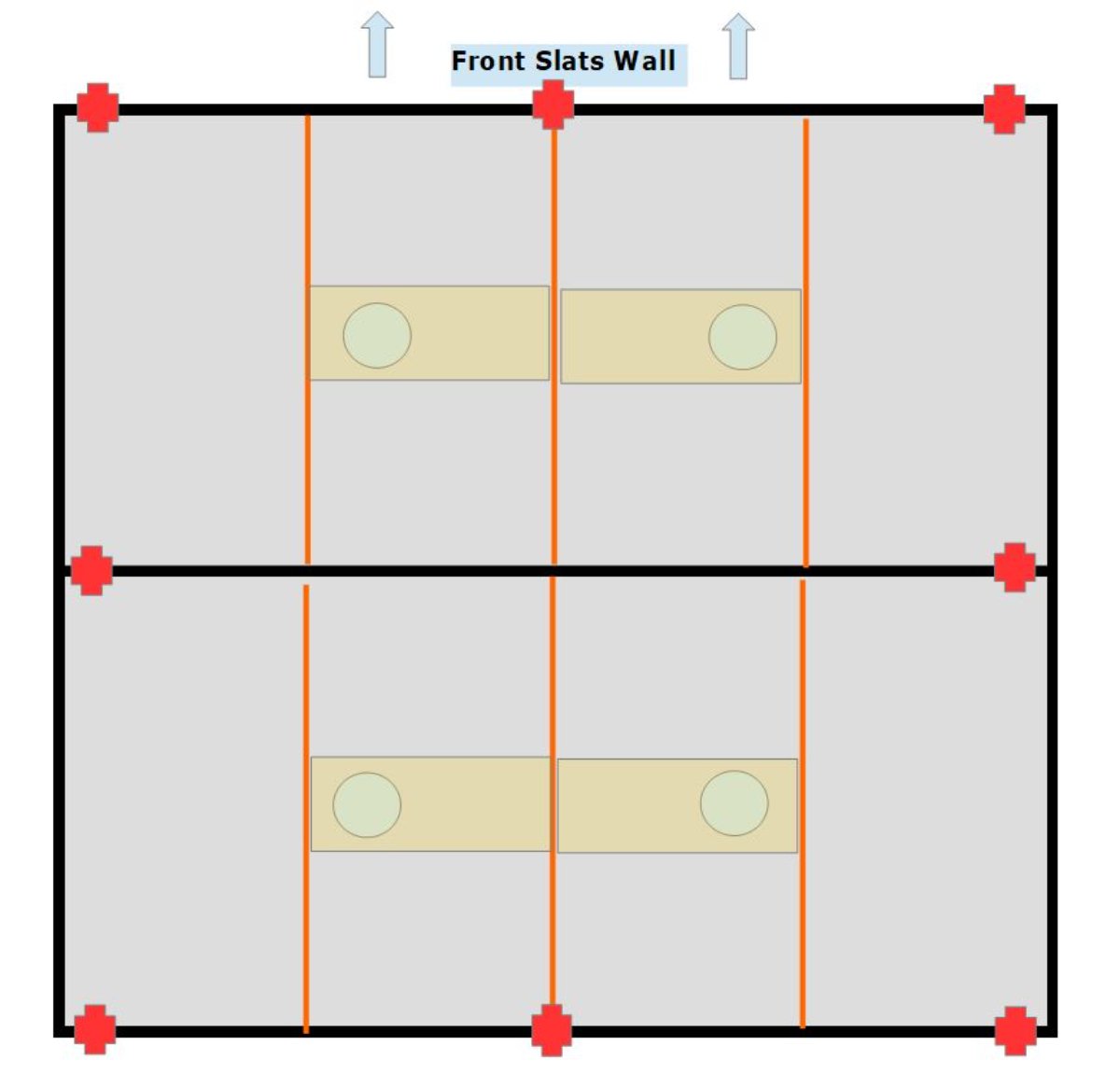 I would first make two 4x8 clouds and then join them together, hanging from the ceiling with 8 anchor points (eye bolts, quick links, and chains) (the red crosses). I want to use multiple anchor points to distribute the weight because I will screw the eye bolts into the slats (because it would be difficult to determine the location of the trusses).