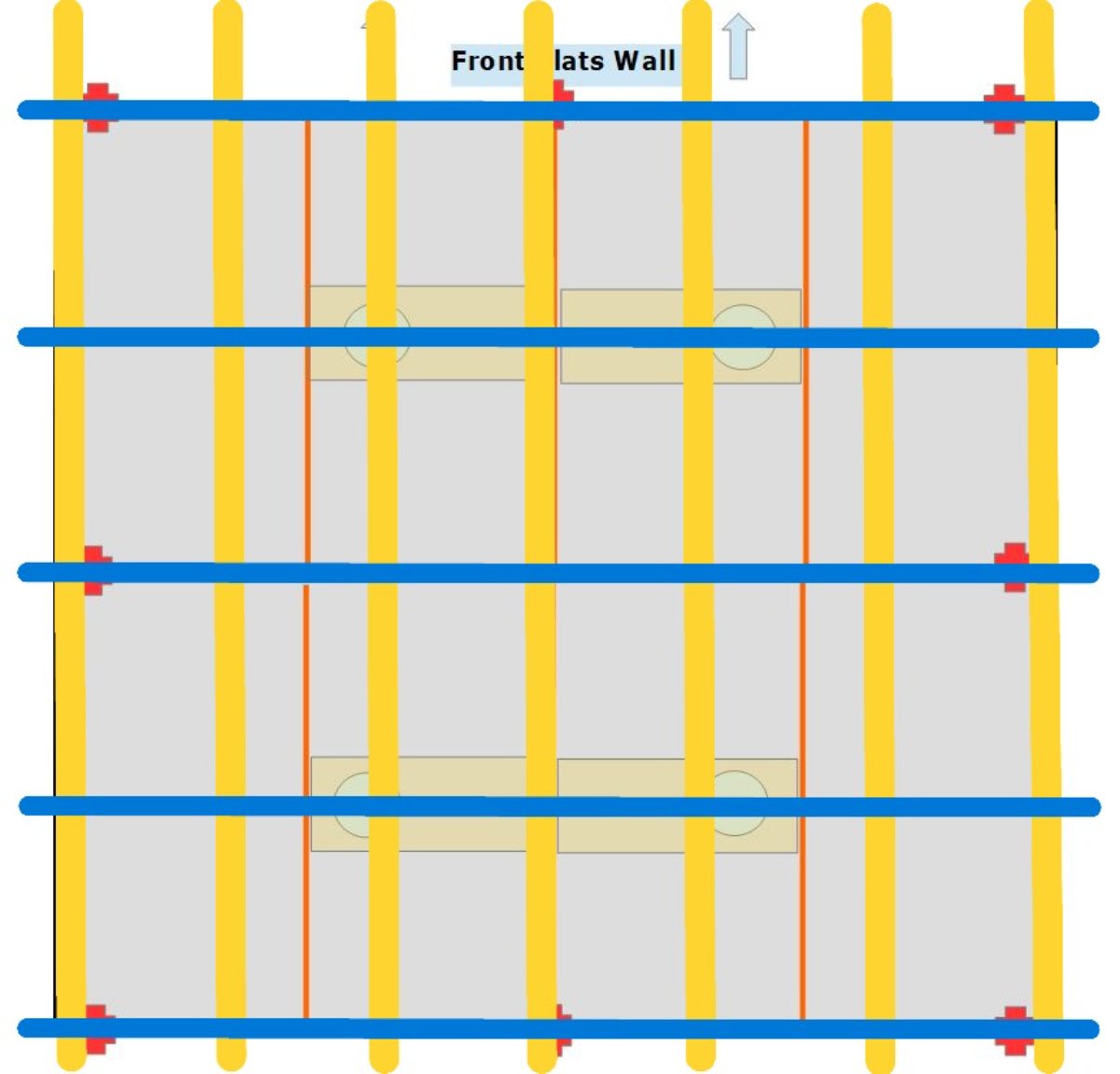 In my case, the 1x3 slats (yellow lines) are nailed to the trusses (blue lines) over the Enermax panels. Then we installed the two layers of drywall. So, with my stud finder, I'll be able to locate the slats and position the chains accordingly (after precisely determining the location of the cloud).