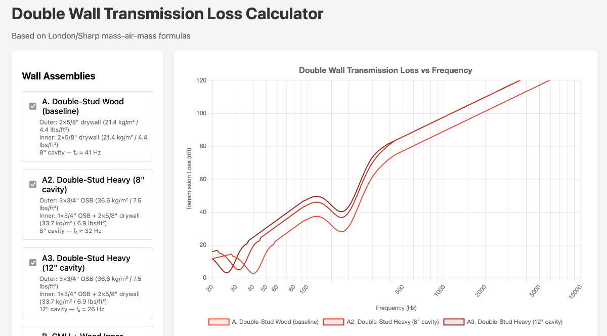 I built a simple transmission loss calculator using the London/Sharp mass-air-mass formulas. The graph attached shows estimated TL across the frequency spectrum for each approach.