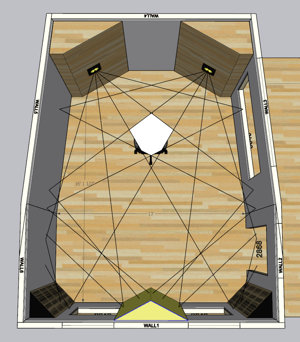 A bit about my design. The sofit faces are 2' 9" wide. They are angled at 35 degrees. My listening position apex is about 6' from the wall (38%) of the room, and my ears are about 18" in front of that. I have positioned the chair about where I would be sitting in the room.