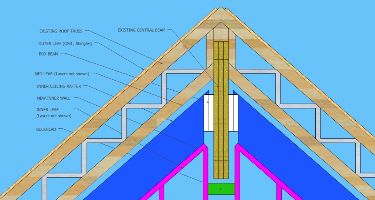 Exactly.Soundman2020 wrote: OK, I think I get it now: You have an existing ridge beam that is basically a truss, and that supports your outer-leaf. Then you plan to build an inner-leaf ceiling frame , and instead of having a ridge beam for that, you plan to build a "box beam" that interleaves through the truss without touching it. Does that sound about right?
