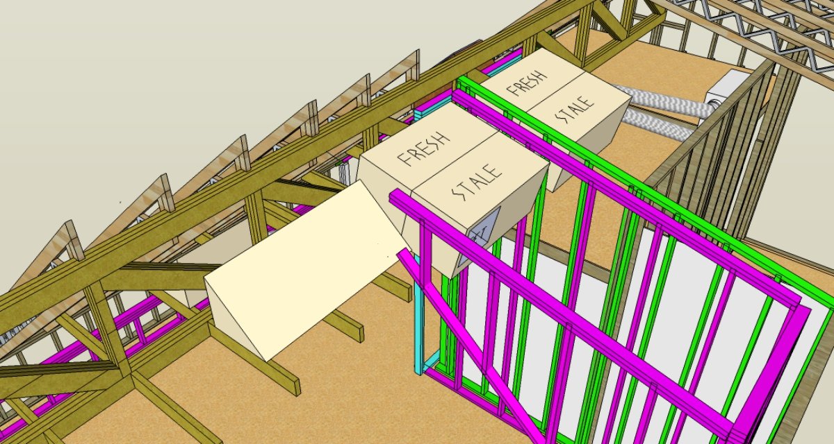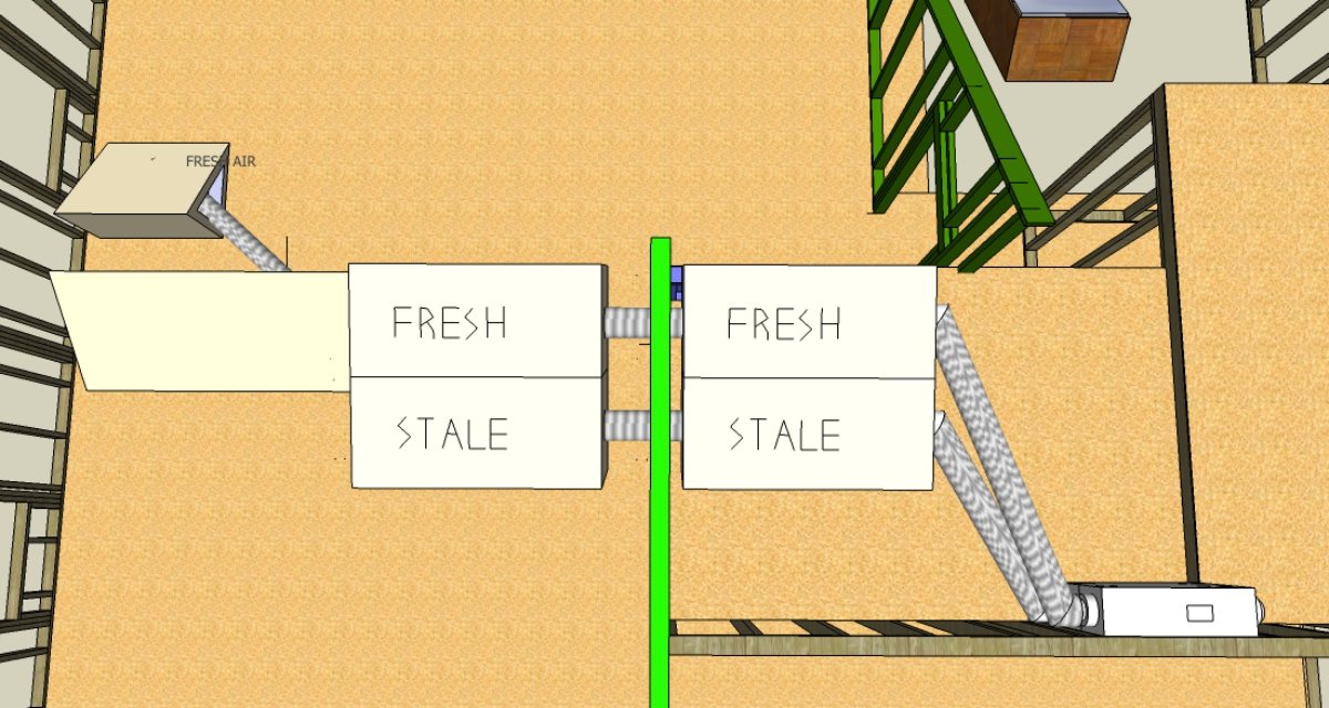 Here is a first sketch of the Fresh Air supplies and Stale Air return along with the four baffles. From the ERV Id use 6" flex duct up to the outer leaf baffles. I'm now considering using 2" duct board to build the baffles. I would again use 6" flexible duct at the penetrations of the inner and outer leaves. (Only the outer leaf wall in green is pictured here):