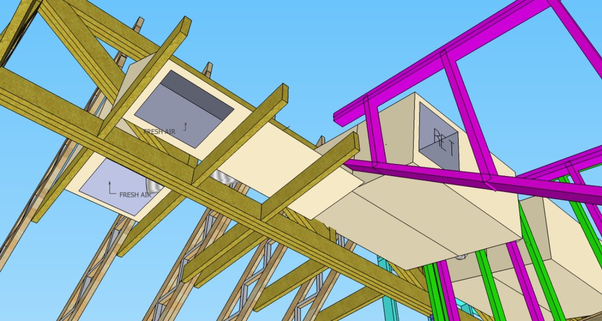 This would create a triangular space above the collar ties, below the inner leaf ≈ 18" wide, 16" high having a cross sectional area of ≈ 144 IN^2. This is about 3 times my required cross sectional area for 200Ft/Min velocity. So the idea would be to use these triangular spaces as expansion chambers to further lower my air velocities. The inside of these triangular voids would be lined with 2" of duct liner.