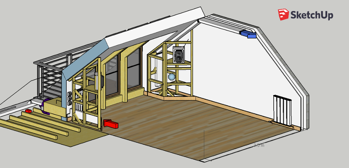 Here's the tentative rough design sketch. Very much at the idea stage - nothing to scale, no calculations done yet, and the duct routing needs work. The fan I'm thinking of is an inline centrifugal quiet type designed for mounting in loft spaces. I'm assuming oversized slow running ones can be used here, and floated on the rafters to prevent vibration transfer if required.