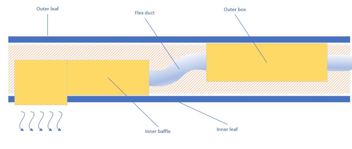 You mention the mass of the duct itself, and the need to have the baffle right against the hole itself. Thanks for confirming that, and of course it makes sense. However, my issue is that since the main HVAC duct is literally right next to the outer leaf, there is not space at all for a baffle box on the OUTSIDE of the outer leaf. So, the alternative is to put it on the inside of the outer leaf. Now, having said that, and based on your input, this might actually be pointless, as there is a duct running from the main HVAC trunk, through the outer leaf, and to this box (a good 10 feet or so).