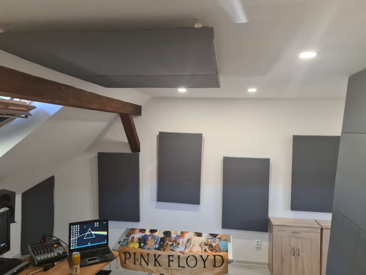 Thank you Soundman for analyzing the measurement and explaining the problems. It's an amateur studio, I don't need professional parameters. The room has its limitations, it will be used only for home recording, mixing. In the untreated back part of the room (behind the chimney) I wanted to install pyramid or barrel diffusers on the sloping walls, or on the back part of the chimney. Now I doubt it will probably not change the fundamental problems of the room and I should focus on the part of the room monitors-chimney. I still have 5 panels of mineral wool 50 mm and one panel hr 100 mm. I put the panels behind the monitors, but I didn't notice any difference in the measurement. Maybe it would help to put a 10 cm panel on the chimney at head height, monitors? I've already thrown away the big table. I'm going on vacation tomorrow, but when I come back I'll try various changes and measurements. If you still have tips on what to focus on and where to try to place the remaining panels or diffusers, I will be happy. The table is symmetrical (arched in front), did you mean the keyboard under the Pink Floyd flag?