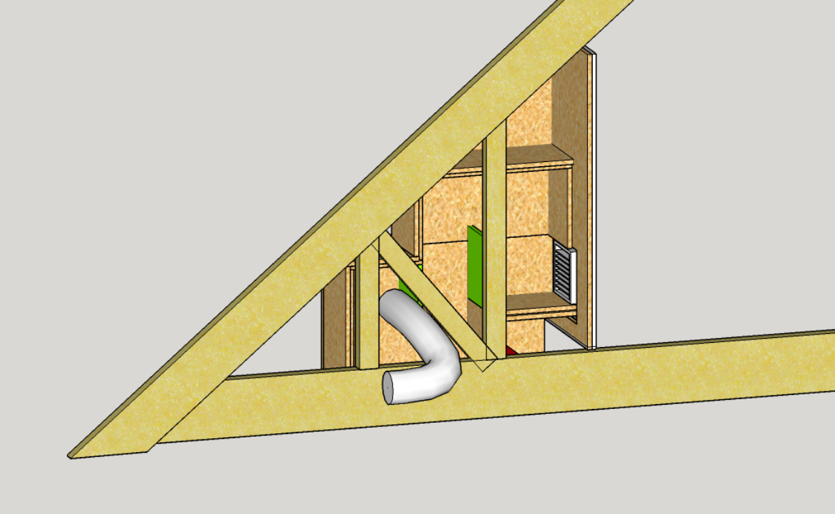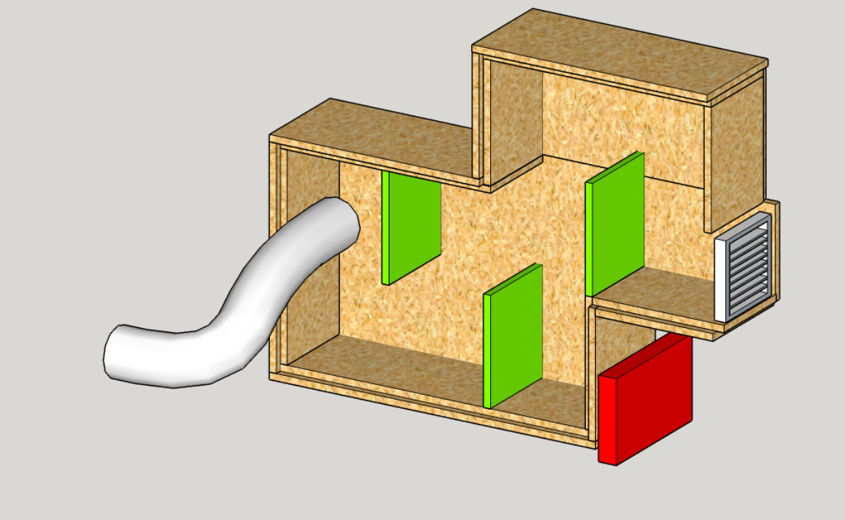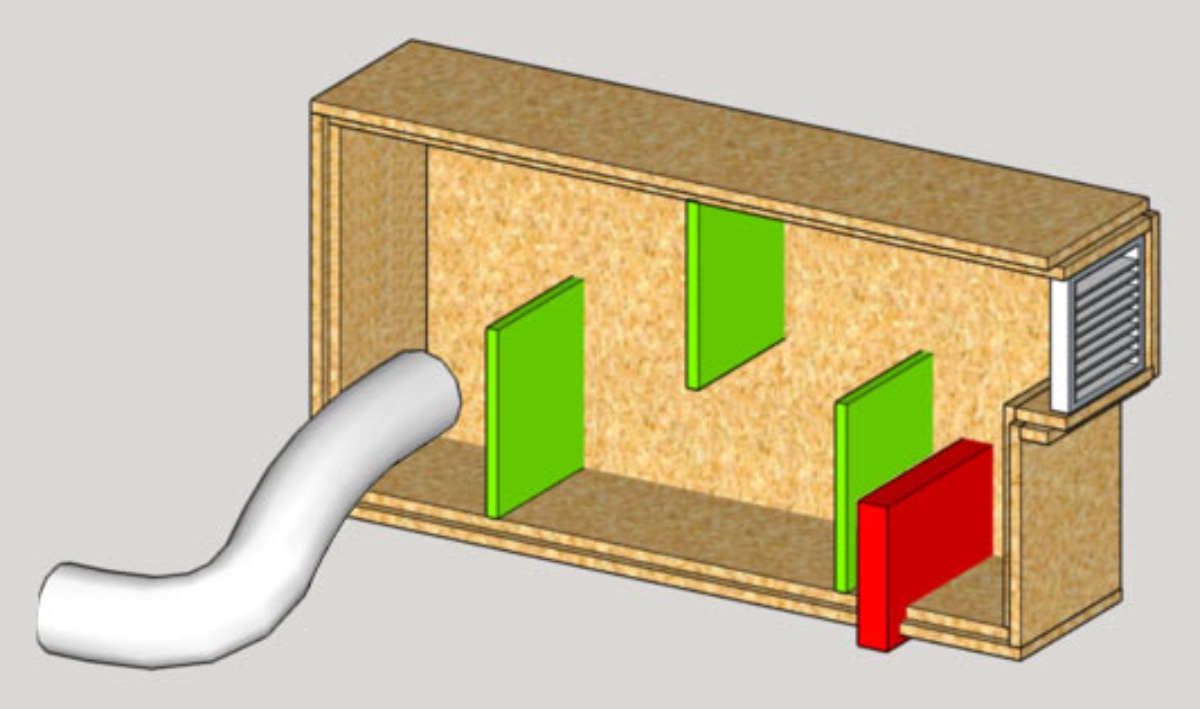 Here's my current working design for the exhaust silencer. 2 baffles so should match the supply silencer. Going to 2 baffles for this one will make a multitude of additional obstructions I've discovered in the eaves on this side irrevlevant.