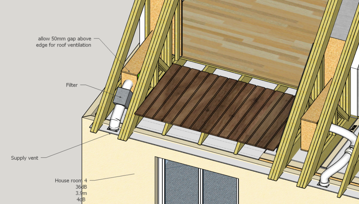 garethmetcalf wrote:Regarding the filter, I wondered whether you could simply put that on the other end of the supply silencer, actually in the room? You could possibly take the outlet of the silencer up and out the top (ie directly up towards the sky), into some ducting and then a filter box, and then ducting out to a supply plenum at the top of the wall...? Easy access from within the room then through a hatch in the wall.